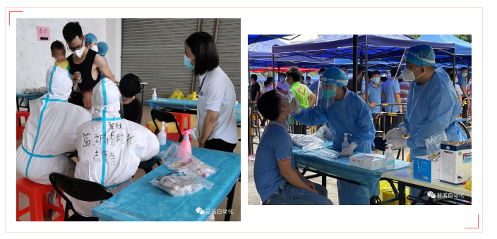 当日,东莞天气骄阳似火、烈日炎炎,室外气温高达三十多度。益诚自动化五名志愿员分两批轮班,投身抗疫一线。他们快速学习了工作要求,迅速上岗,承担了医护人员采样辅助、封瓶、包装检测试管等工作。