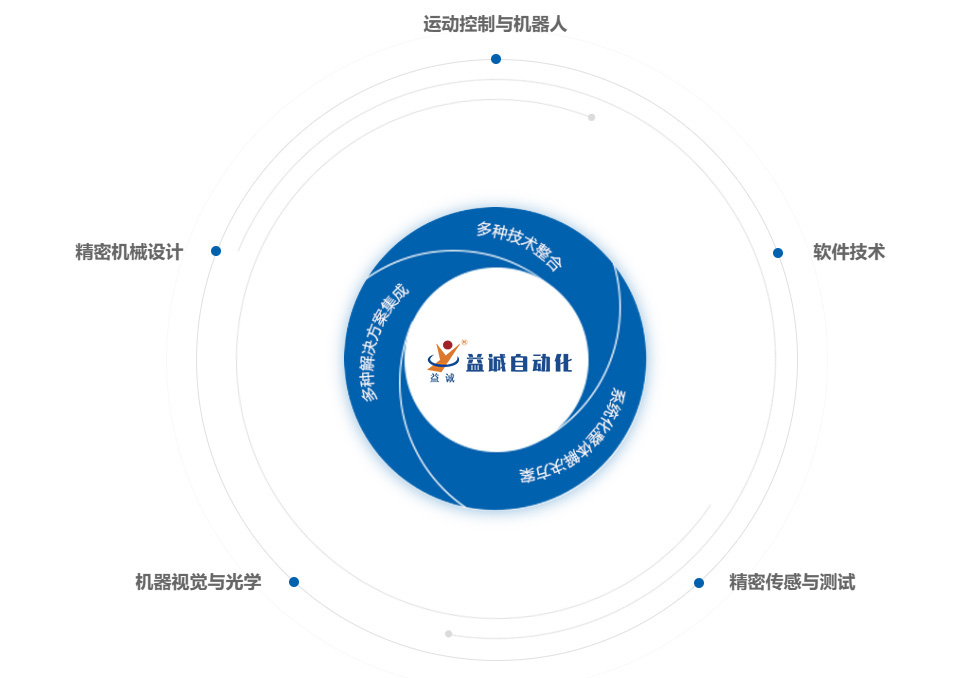 益诚自动化成立于2007年,已通过ISO9001:2015质量管理体系认证,是一家高新技术企业,东莞市工程技术研究中心,设有一个博士工作站。总公司位于广东省东莞市,在沈阳、苏州、印度尼西亚设有分公司,在香港特别行政区和德国设有办事处。并与2021年在浙江、韶关自建智能制造工业科技园。益诚自成立以来专业从事非标自动化生产设备、视觉定位与检测、工业多轴机器人的研发、制造与服务,以及为生产企业提供智能制造整体解决方案。益诚拥有一支由100余名专业工程开发人员组成的研发团队。在汽车配件、电子电器开关插座、精密微型马达、散热风扇、机械手等生产领域,为各生产企业提供多元化的自动化解决方案。为使益诚的研发能力能得到持续提升,为市场提供更优质的服务,益诚与国内多家高等院校建立了”产、学、研“合作关系,并与德国著名的自动化设备制造商”SUSO Automation“结成战略合作伙伴。